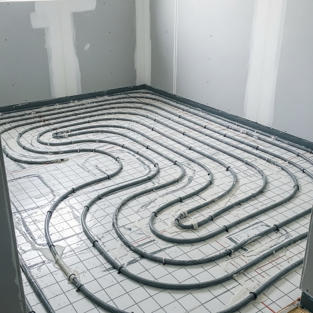 Professionell installation av vattenburen golvvärme med systematiskt lagda rör för optimal värmefördelning. Visar den tekniska processen bakom komfortabel golvvärme.