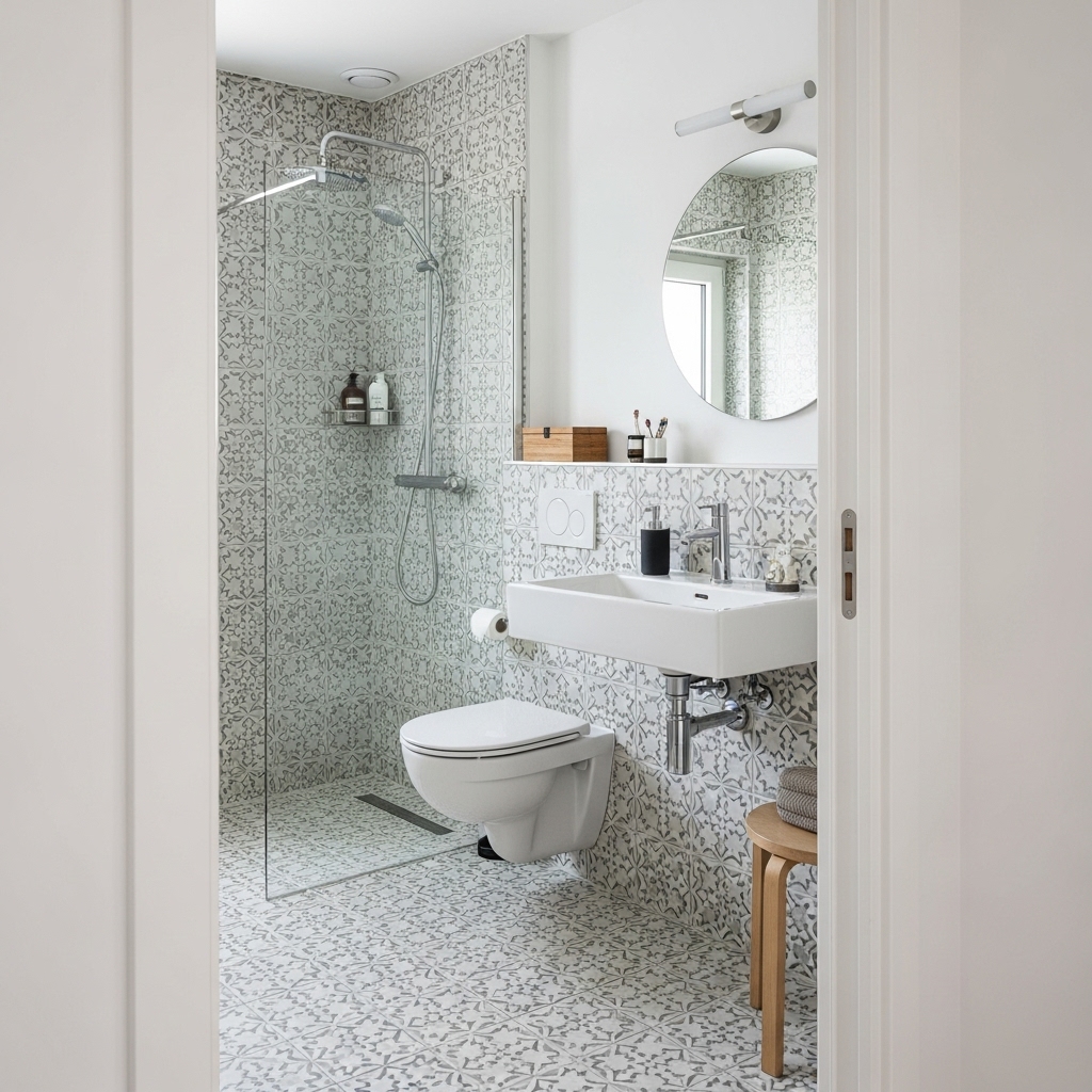 Kompakt Premium Badrum med Mönsterkakel och Modern Duschlösning