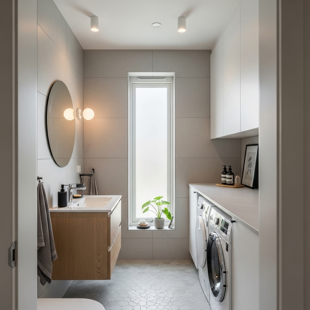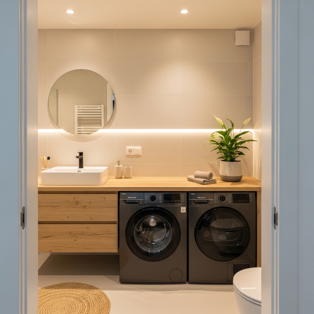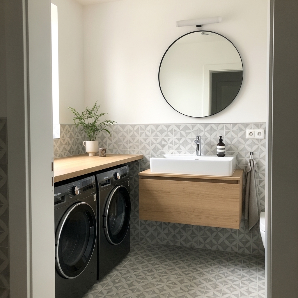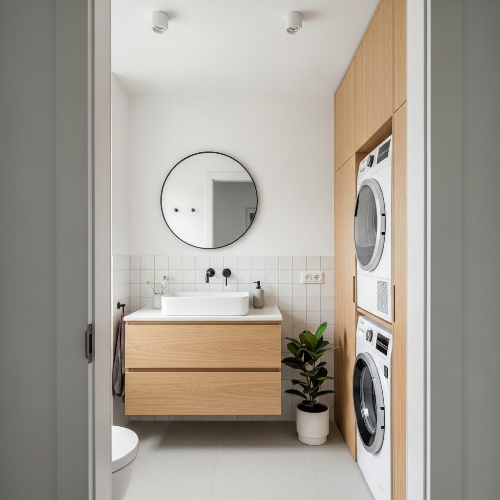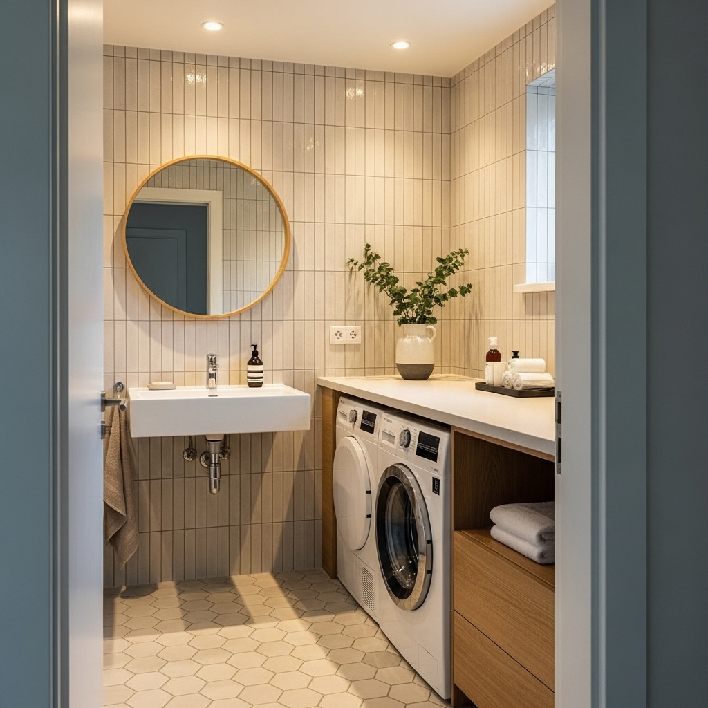 Praktiskt och Stilrent Badrum med Integrerad Tvättlösning